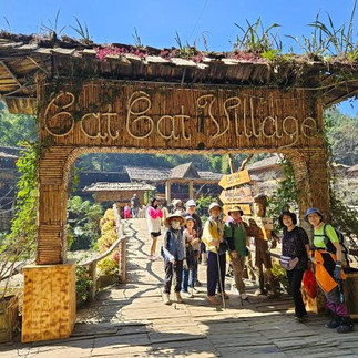 車でカットカット村へ。チケットをもらって村の入り口から入り、ファンシーパンが望める高台で記念撮影。通りの両サイドに土産物が並び、お肉を焼くいい匂いが漂っていた。民族色豊かなおうちの中も公開されていた。
