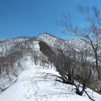 細尾根に到着 北白老岳の山肌は雪解けが進み木の根元のくぼみが大きい 木もかなり混んでいた 登れても帰りが大変そうと判断し、今日のピークはここに決めた